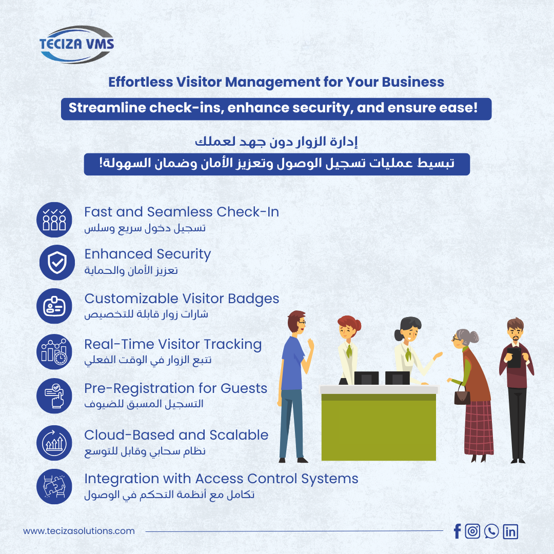 Teciza VMS (Visitor Management System) is a comprehensive solution designed to streamline and secure the process of managing visitors to your organization. It helps monitor, track, and ensure the safety of visitors while enhancing the overall visitor experience.